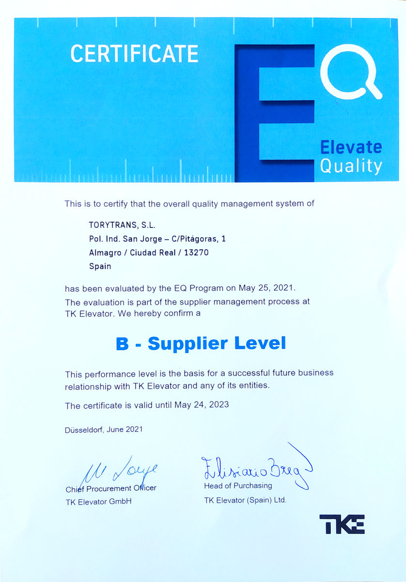 This certificate recognizes the work of Torytrans to maintain the high quality standards in the products and services we offer to our customers and that define our company.